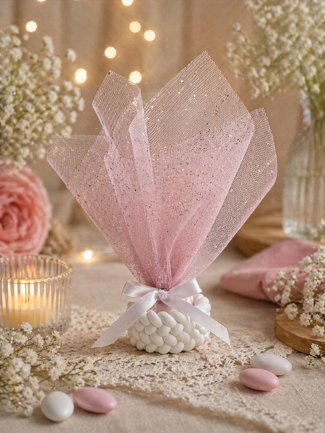 Μπομπονιέρα ολοκληρωμένη με διπλό τούλι και 5 κουφέτα crispy Χατζηγιαννάκης.